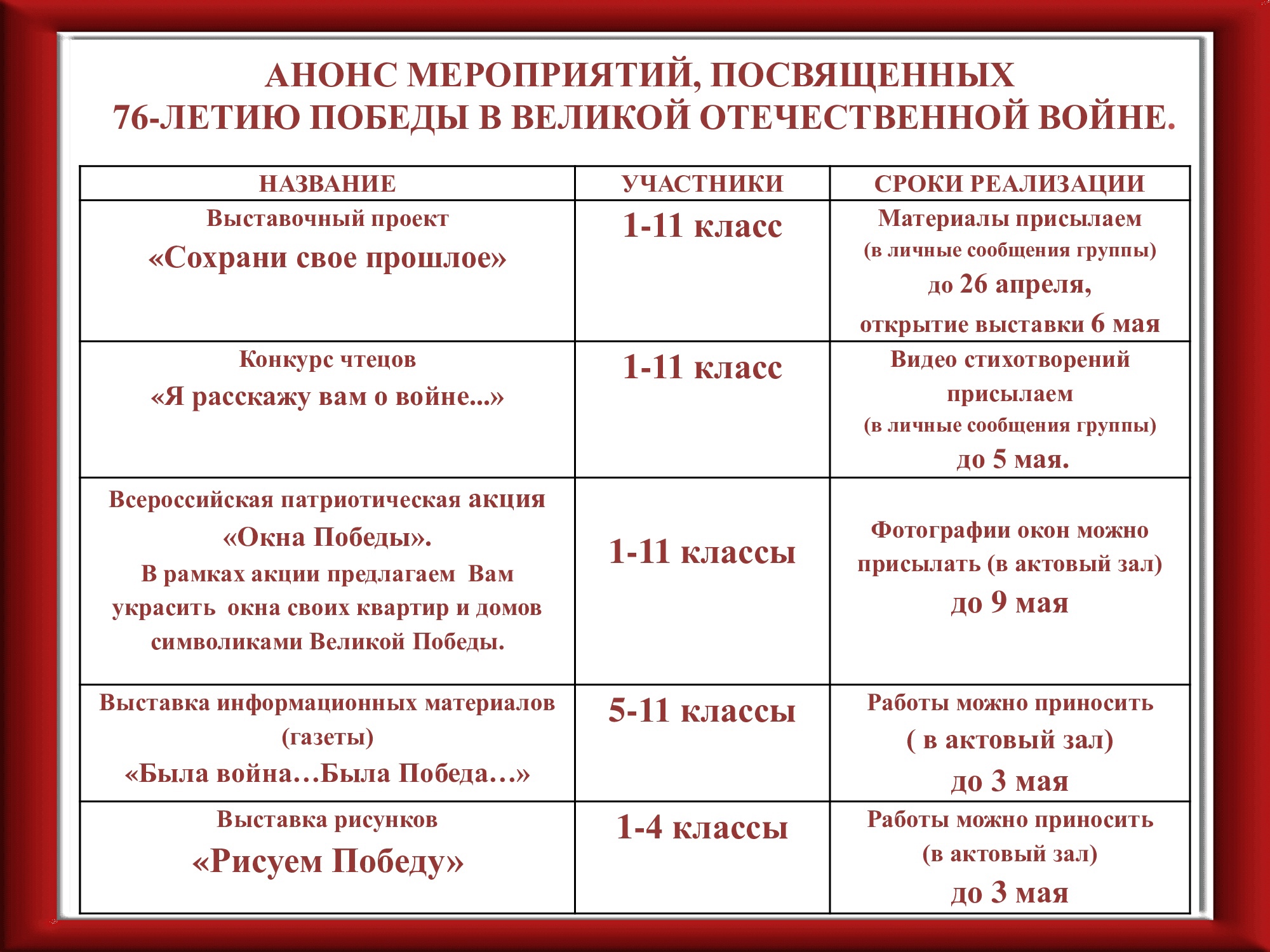 Приглашаем вас принять участие в мероприятиях, посвященных Дню Победы.